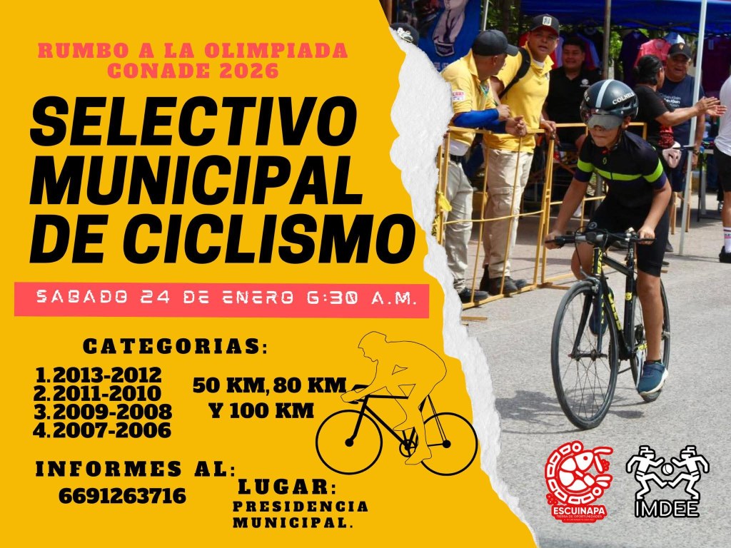 El H. Ayuntamiento de Escuinapa, a través del Instituto Municipal del Deporte y Cultura Física de Escuinapa (IMDEE), lanzó la convocatoria para el proceso de selección municipal de ciclismo, con miras a conformar el equipo que representará al municipio en las etapas clasificatorias rumbo a la Olimpiada CONADE 2026.